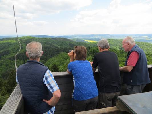 Mit knapp 18 km Wanderstrecke und 400 Höhenmetern haben wir heute eine etwas anspruchsvollere Tour geplant. Am Treffpunkt finden sich 9 Wanderlustige ein und starten mit 2 Autos nach Bodenwerder. Nach einem steilen Anstieg laufen wir immer auf dem Kammweg durch den Vogler. Drei Aussichtspunkte liegen an der Strecke. Zuerst erreichen wir die Königszinne, dann den Bodoturm und zum Schluss den Ebersnackenturm. Alle drei werden bestiegen und wir genießen einen tollen Blick in die Ferne.